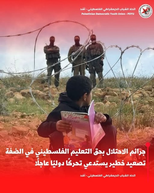 ” الديمقراطية ” استهداف جيش الإحتلال والمستوطنين بجرائمهم للمدارس يتطلب تدخلا دوليا… ومجزرة مدرسة ” المغير ” بالأمس، نموذج للتطهير العرقي والحرب على التعليم والطفولة