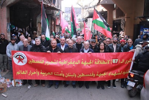 في ذكرى انطلاقتها السابعة والخمسين: الجبهة الديمقراطية تنظم مسيرة جماهيرية حاشدة في مخيم برج البراجنة مجددةً الدعوة لإنهاء الانقسام واستعادة الوحدة.