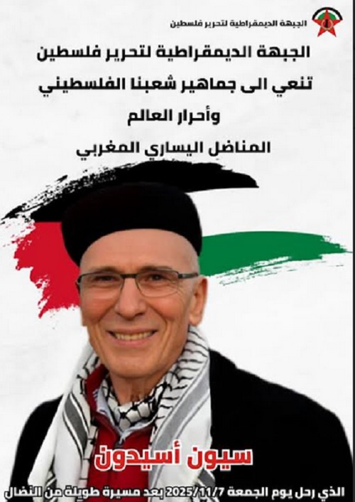 الجبهة الديمقراطية تنعي المناضل اليساري المغربي سيون أسيدون برحيله فقدت فلسطين مناضلاً كبيراً ومدافعاً عنيداً عن حقوق الشعب الفلسطيني.